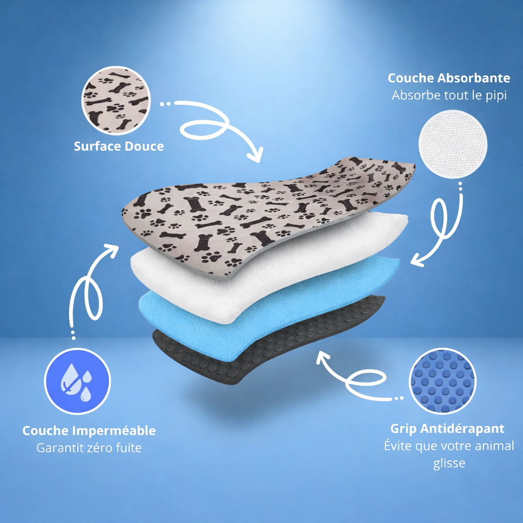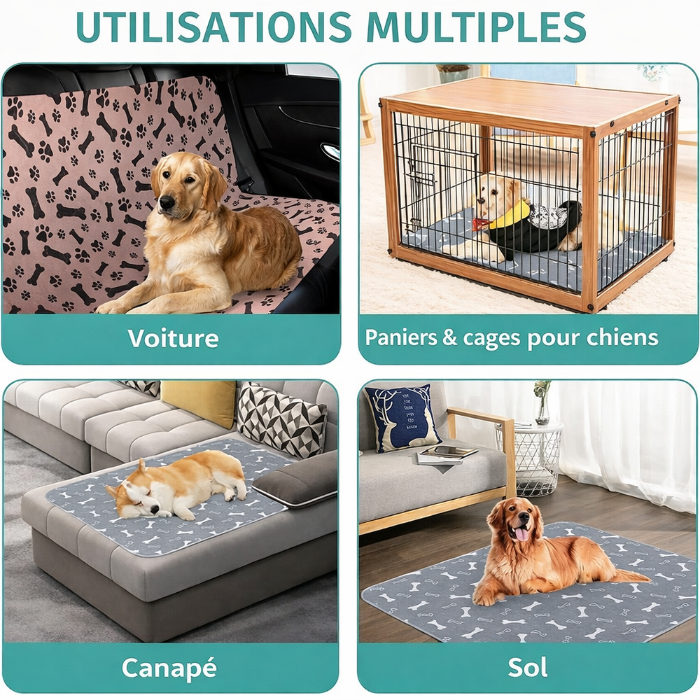 Conçu avec des matériaux résistants et non toxiques, il s’adapte à tous les usages du quotidien : apprentissage de la propreté, protection des lits et canapés ou placement sous les gamelles.
